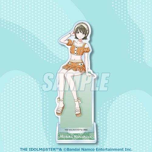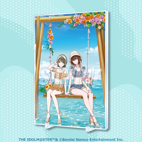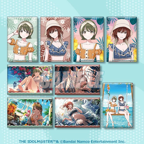 商品は水着衣装に身を包み、ユニット別スタイルブックの表紙にもなった「七草にちか」「緋田美琴」の特大タペストリーやアクリルスタンドのほか、バッグの中身ページで紹介されたアイドルたちが持ち歩いている愛用品のイラストを使用した3個セットのアクリルミニチャーム、ゲーム内で使用された歴代の水着イラストやカードイラストを使用したミニブロマイドセットやスクエア缶バッジ等、オリジナルグッズを多数展開しております。