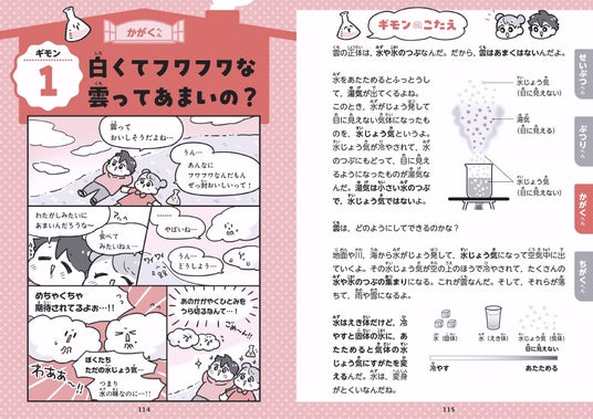 たとえば「ウサギの耳はなぜ長いの?」「白くてフワフワな雲ってあまいの?」「かみなりはなぜ光と音がバラバラなの?」など、思わず大人も一緒に考えたくなる楽しいギモンがいっぱいで、理科の現象や大切なしくみが一緒に学べるようになっています。