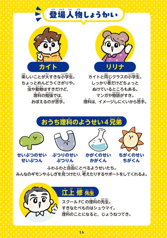 「教科書や、普通の参考書はなかなか読み進められない……」「理科は複雑で覚えることも多くて苦手意識が強い」という小学生でも大丈夫! 本書は見開き4ページ完結。最初の導入がマンガなので、楽しく読み進められます。カイトとリリナという小学生二人が主人公。理科のようせい4兄弟といっしょに、ギモンにせまります。