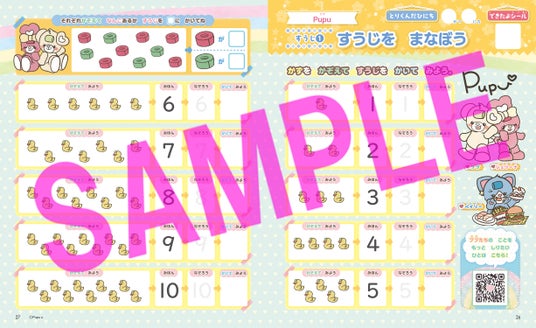 人気のキャラクターたちといっしょに学べるドリルのページは、ひらがなやカタカナ、お話の読み方、数え方、時計の読み方などが学べる大充実の内容です。