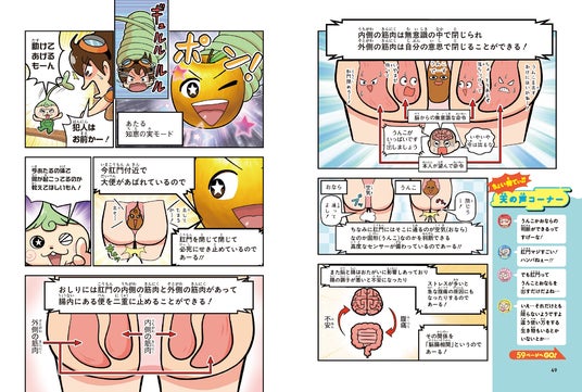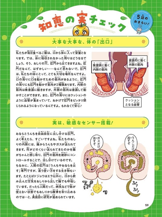 ▲5話「授業中の大ピンチ!―肛門のチカラ―」の解説ページ。本編の復習に加え、さらなる学びが広がります。