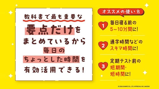 本書では、サンリオの人気キャラクター、ポムポムプリンが随所に登場します。やさしく親しみやすい世界観が、勉強への心理的ハードルを下げ、「社会はちょっと苦手……」という中学生でもページをめくりやすい工夫につながっています。学習参考書にありがちな堅さを抑え、「続けやすさ」を重視した設計です。