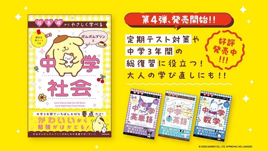 そんな悩みに応える新しい学習参考書として、サンリオキャラクターの中学参考書シリーズに『超基礎からやさしく学べる ポムポムプリンと中学社会』が仲間入りしました。