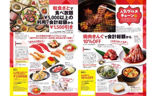 ほかにもジョリーパスタ、ピザハット、サンマルクカフェ、ヴィ・ド・フランス、来来亭、らーめん まこと屋、ゼッテリア、ほっともっと、情熱ホルモン、焼肉五苑、ニクノヒ、じゅうじゅうカルビ、トマト&オニオン、お好み焼ゆかり、鶴橋風月、創作オムライス ポムの樹、キッチンオリジン・オリジン弁当が割引に!