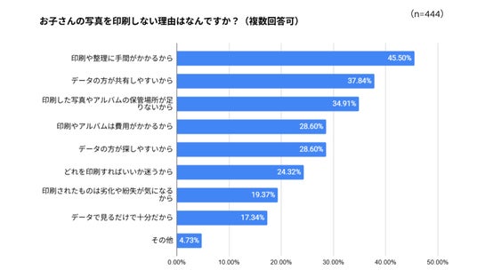 一方、写真を印刷しない理由としては、「印刷や整理に手間がかかるから(45.50%)」が最も多く、次いで「データの方が共有しやすいから(37.84%)」、「印刷した写真やアルバムの保管場所が足りないから(34.91%)」、「印刷やアルバムは費用がかかるから(28.60%)」といった理由が挙げられています。自由回答を見ても、「写真をたくさん撮るので、印刷するのに時間がかかり追いついていないこと。良い写真のみを印刷するようにしていますが、その場合子供の色々な場面を思い出に残せないと思うと少し悲しさがあります。」「0歳の時は育休中で少し余裕があり、写真を印刷したり、写真館に行ったりできていたが、仕事を開始してからそのような余裕もなく…。気軽に記念写真っぽくなるしくみなどあると良いなと思います。」など、理想と現実のギャップに悩む声は多く寄せられました。