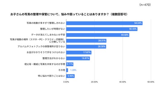 写真の整理や保管についての悩みを聞くと、トップは「写真の枚数が多すぎて整理しきれない」で54.04%、僅差で「整理したいが時間がない」が50.43%となりました。3位以降にも「データが消えてしまわないか不安(44.68%)」、「写真が複数の場所に分散している(28.51%)」、「アルバムやフォトブックの保管場所が足りない(28.30%)」といった回答が続き、94%の方が何らかの悩みを抱えていることがわかりました。自由回答でも、「前の携帯からの写真データが引き継がれていてかなりの量があり、もはや整理する時間もなくて大変困っています。」という切実な声や、「子どもが生まれてからスマホ内の写真が増え、無料分のクラウド容量をあっという間に越えました。買い増ししていますが、それも満杯になりそうです。」と、デジタルならではの容量不足に直面しているエピソードも寄せられました。他にも非常に多くのお悩みが寄せられましたが、共通しているのは「どうにか子どもの思い出を残しておきたい」という気持ち。「幼い頃の思い出はせめて写真にしてでも残しておきたいです。二度とその頃には戻れないので。」という温かいコメントも寄せられました。